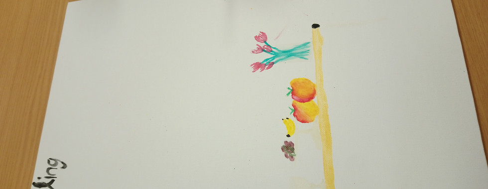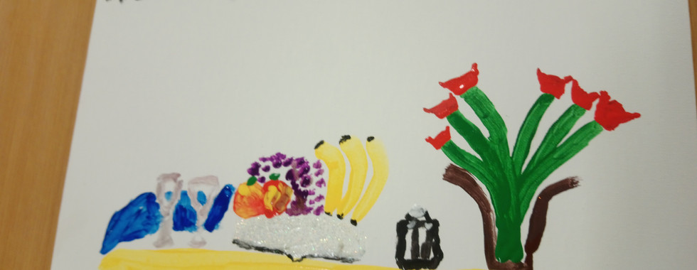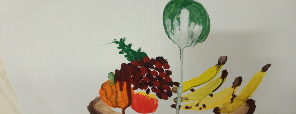 We set the scene with a table containing fruit, flowers and some accessories. Issues everyone with an A3 canvas paint board and shared out paints and brushes.